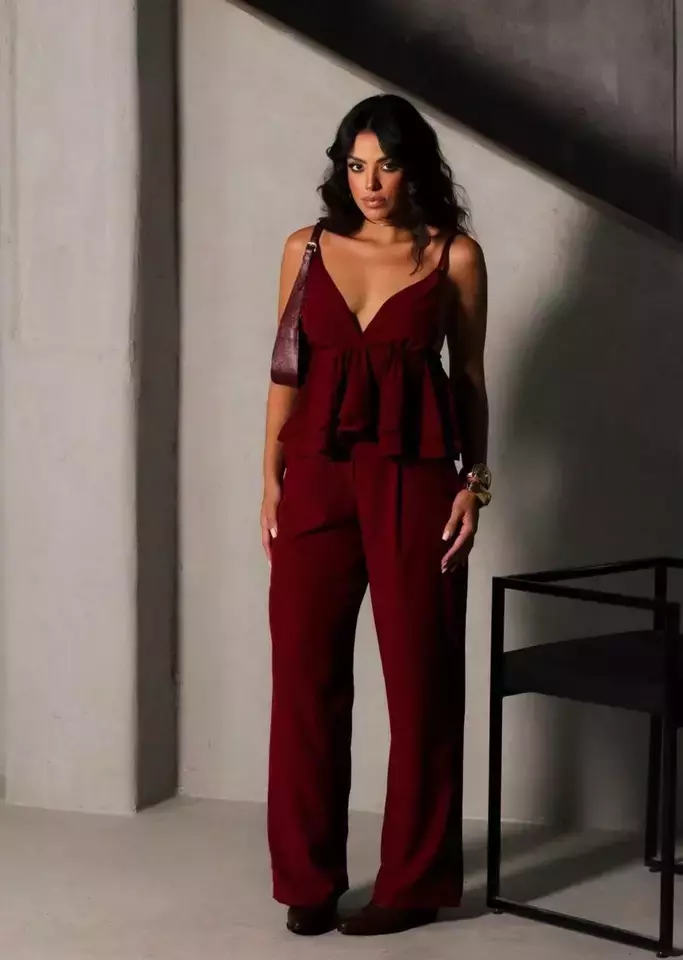 O auge da elegância é esse conjunto. A escolha perfeita para o verão 2025. A pantalona fluida proporciona um caimento impecável e um conforto excepcional, enquanto a blusa com delicados babados adiciona um toque de sofisticação e feminilidade. Este conjunto combina estilo contemporâneo e sofisticação, garantindo que você se destaque com classe e charme em qualquer ocasião. Ideal para quem busca um look chique e atualizado com as tendências da temporada. (tecido em crepe, não amassa)