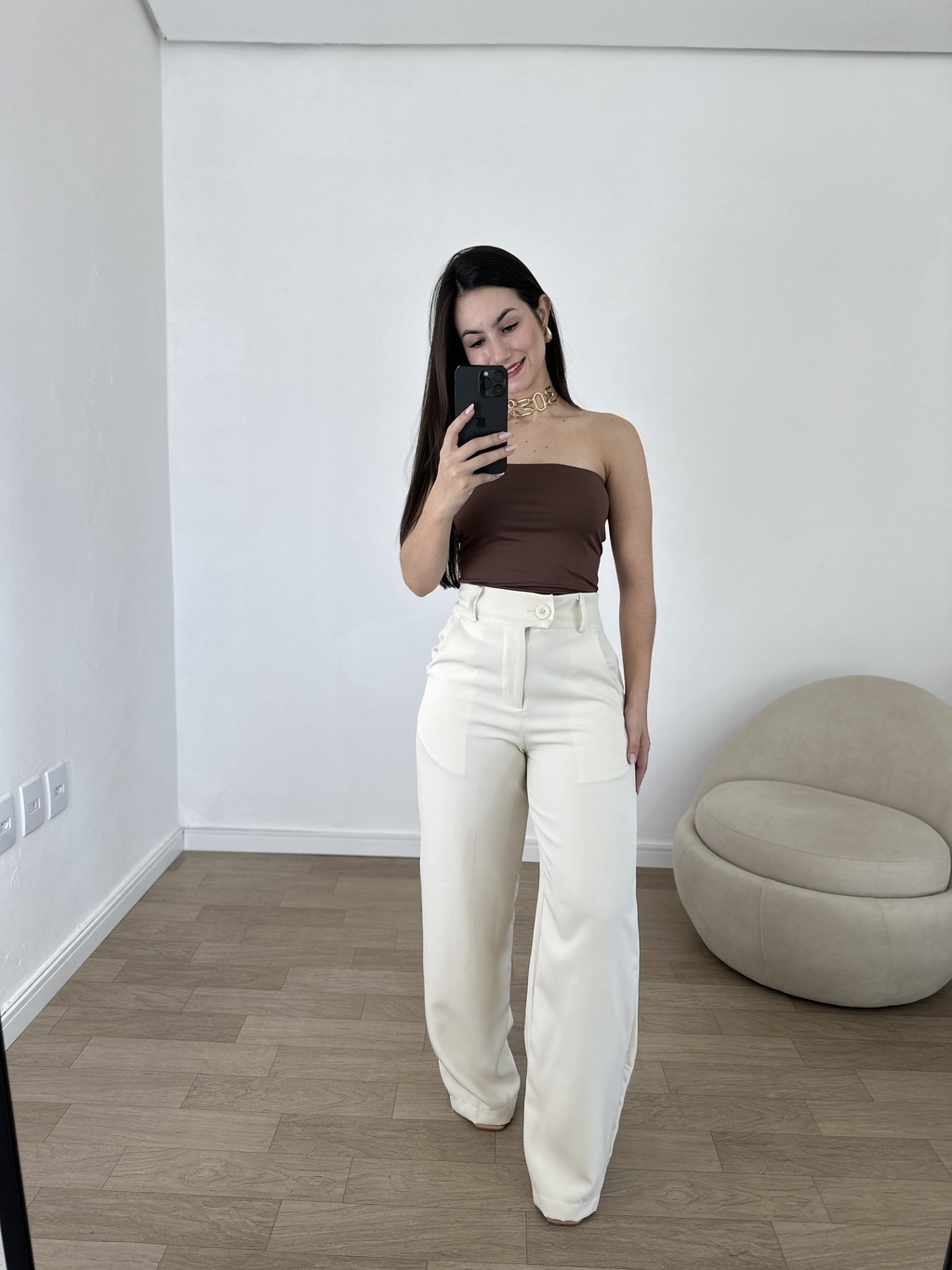 /Calça pantalona confeccionada no tecido alfaiataria.